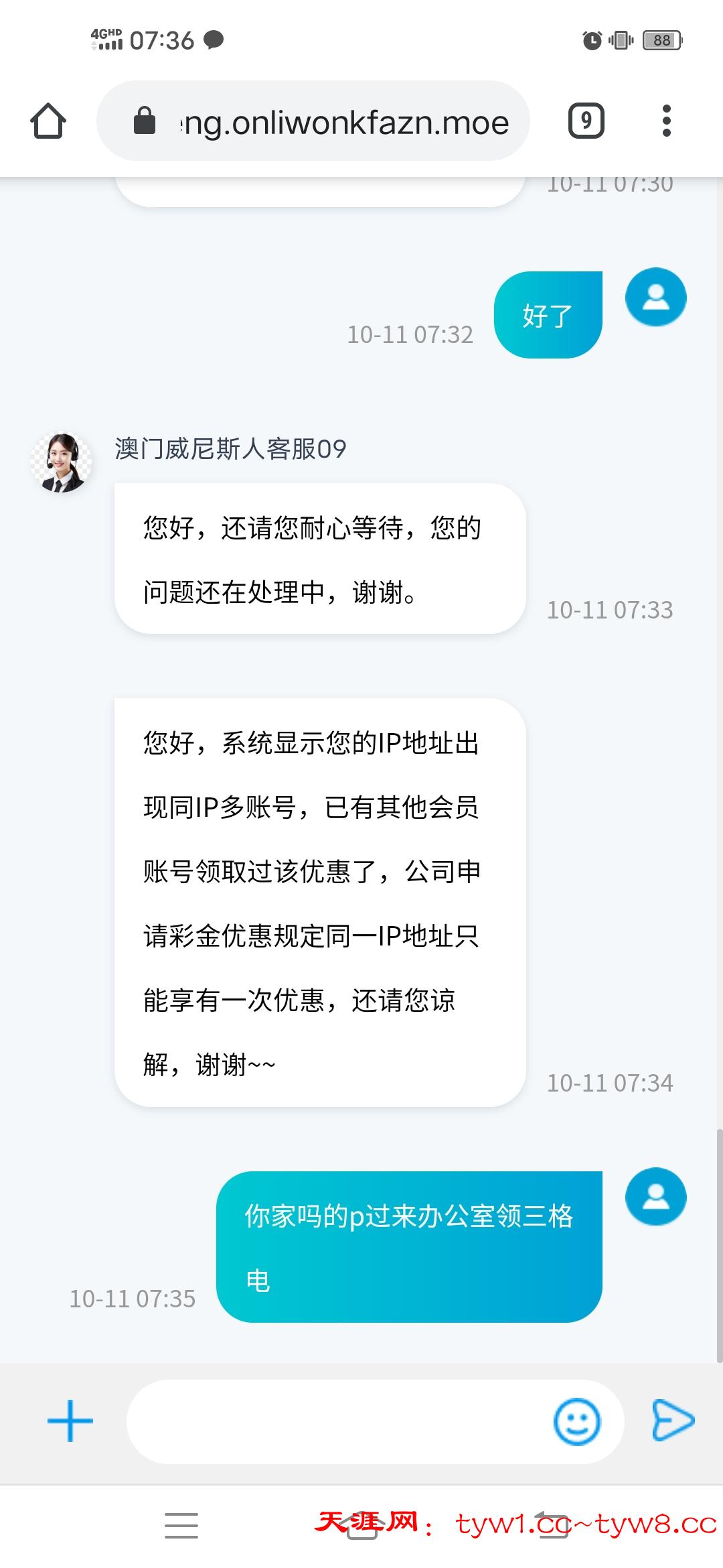 您好,系统显示您的IP地址出现同IP多账号,已有其他会员账号领取过该优惠了,公司申请彩金优惠规定同一IP地址只能享有一次优惠,还请您谅解,谢谢~~