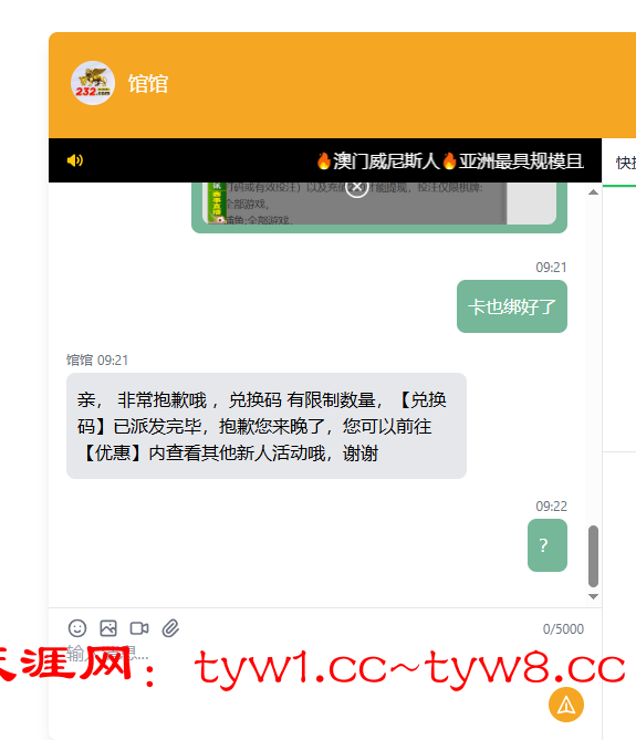 亲, 非常抱歉哦 ,兑换码 有限制数量,【兑换码】已派发完毕,抱歉您来晚,您可以前往【优惠】内查看其他新人活动哦,谢谢谢